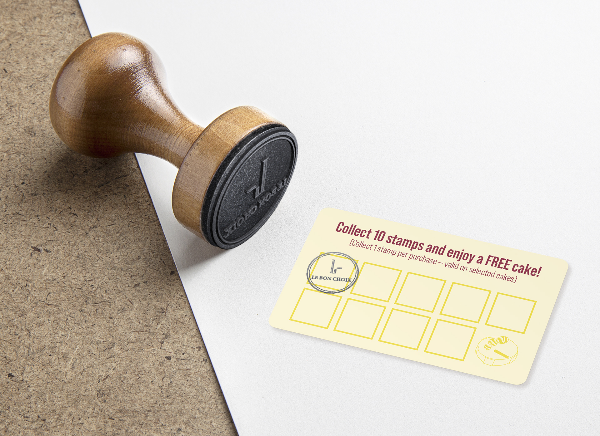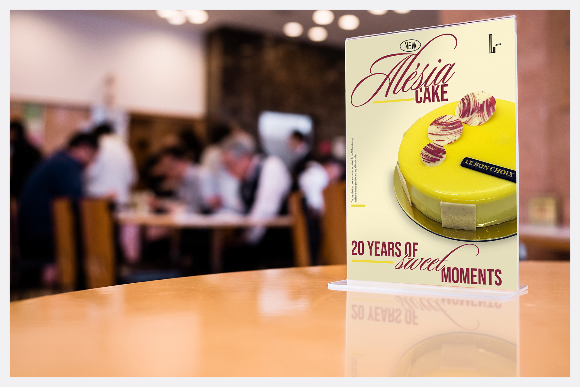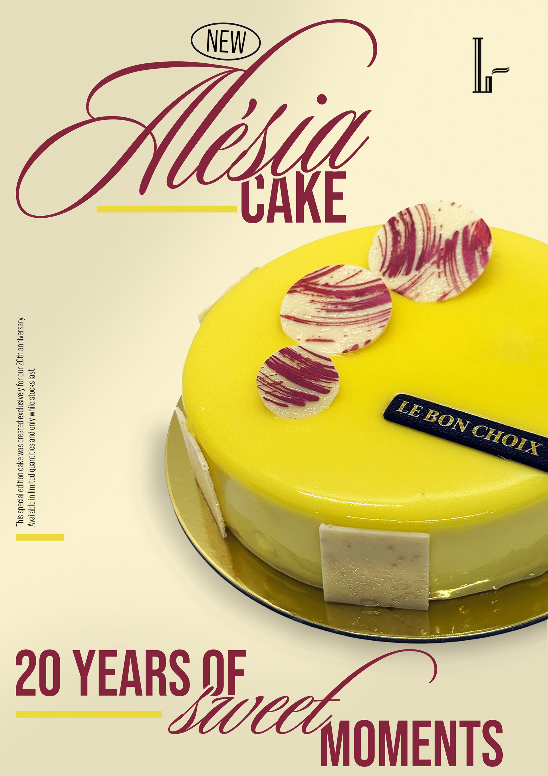 To celebrate 20 sweet years, Le Bon Choix is launching a boutique campaign featuring Alésia, a limited-edition anniversary cake. The in-store print will invite customers to discover this exclusive creation and join the celebration. A matching loyalty card rewards guests with a free mini Alésia cake after 10 purchases. The design should reflect the brand’s elegant French style with soft blush, cream, and gold tones — blending sophistication with a festive, welcoming feel.